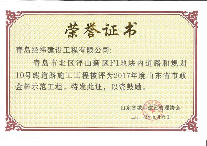 公司長(zhǎng)期以來堅(jiān)持以人為本,誠(chéng)信經(jīng)營(yíng),客戶至上、,互利共贏,奉獻(xiàn)社會(huì),回報(bào)大眾,在青島本地市政企業(yè)中擁有良好的口碑,多次榮獲青島市市政行業(yè)安全文明示范工地以及優(yōu)秀項(xiàng)目經(jīng)理榮譽(yù),為發(fā)展地方城市建設(shè)做出了積極的貢獻(xiàn)。